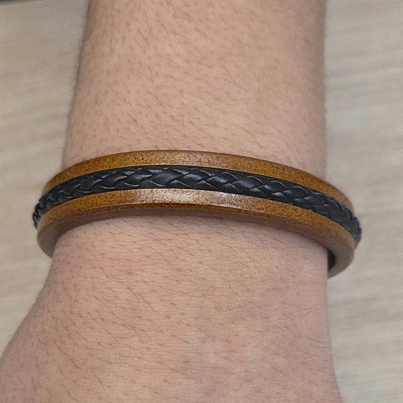 Para el que prefiere lo sencillo. Brazalete delgado de cuero negro con un detalle café. Es liviana y discreta.