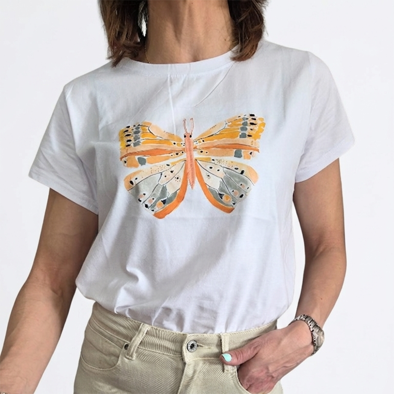 El look de la foto: Queda espectacular con nuestra camiseta blanca «Mariposa» para un aire fresco y primaveral.